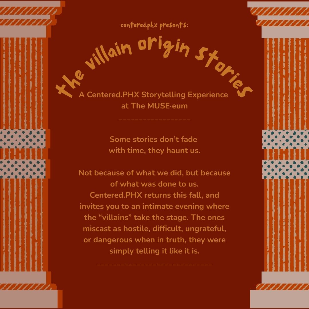 Centered.PHX returns this fall, and invites you to an intimate evening where the “villains” take the stage. The ones miscast as hostile, difficult, ungrateful, or dangerous when in truth, they were simply telling it like it is.